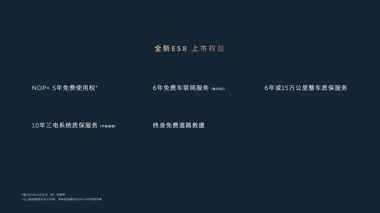 2025年12月31日(含)前下定蔚来全新ES8的用户,将享受以下权益: 5年免费全域领航辅助NOP+使用权,以及价值2,980元的飞航头等舱五件套,包含舒适软枕套装、第三排侧窗遮阳帘、全车簇绒脚垫、前备舱防护储物垫以及智能香氛瓶套装。全新ES8首任车主还可享受6年免费车联网服务、6年或15万公里整车质保服务、10年不限里程三电质保服务和终身免费道路救援。