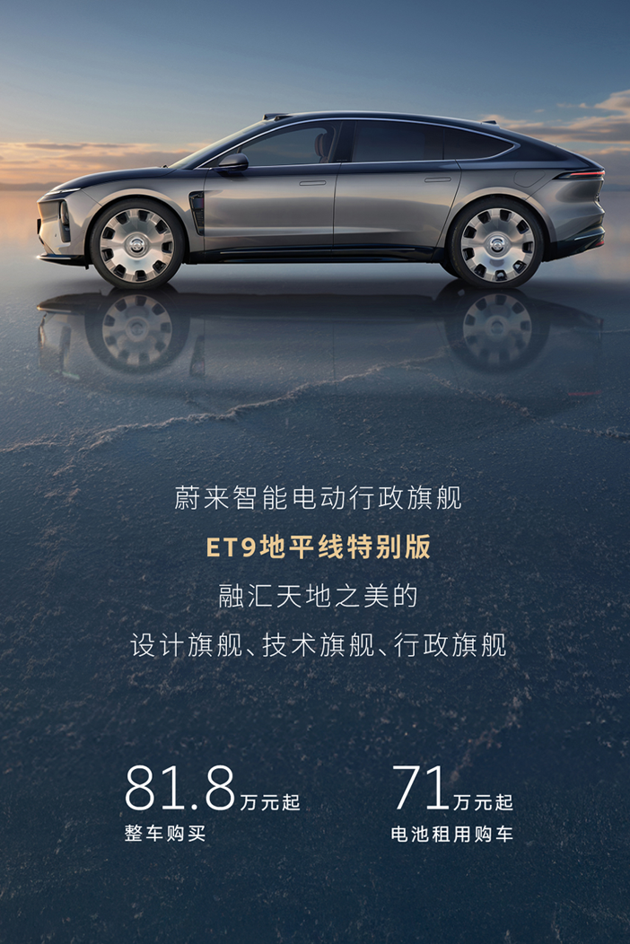 与此同时,蔚来 ET9 地平线特别版正式上市,售价 818,000 元起,采用 BaaS 电池租用方式购买,售价 710,000 元起。ET9 地平线特别版将于 9 月底开启交付。