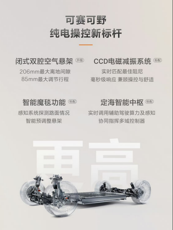 底盘方面,焕新极氪001全系标配CCD电磁减振系统,并且还拥有了定海智慧中枢,没错,就是极氪9X上面那套!支持智慧魔毯功能,可感知探测路面情况来预调悬架,并且空气悬架由老款的开式双腔空悬升级为闭式双腔空悬,最大离地间隙206mm,最大调节行程85mm,比较期待上市后实车的行驶质感。