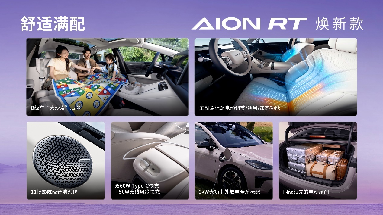 空间表现上,AION RT焕新款后排头部空间达940mm,腿部空间943mm,媲美B级轿车标准。全系标配双电动遮阳帘、50W无线快充、电动尾门及双60W Type-C接口,后排更配备双独立快充口,可同时为两台设备供电。此外,11扬声器音响系统与热泵空调的加入,进一步强化了车内娱乐与温控体验。
