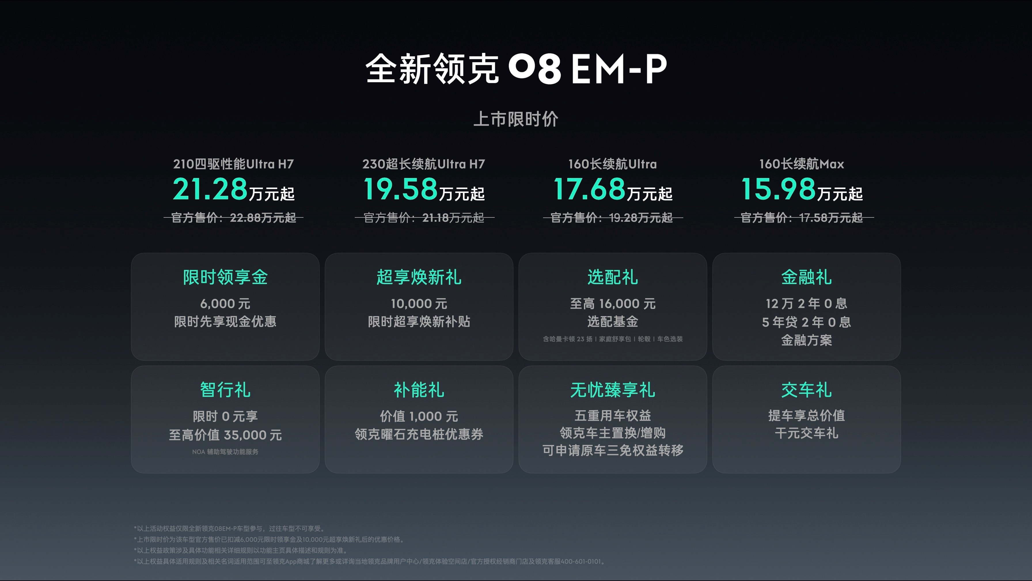 9月24日,新款领克08 EM-P在上海正式上市,新车作为现款领克08 EM-P的中期改款,全系标配激光雷达,在驾驶辅助、智能座舱和外观/内饰方面均有所升级。新款领克08 EM-P根据续航和配置差异共发布4款车型,官方指导价为17.58万元-22.88万元,叠加权益的上市限时价为15.98万元-21.28万元。