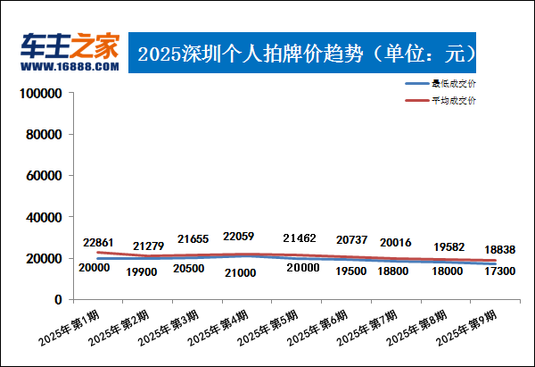 深圳9月拍牌价进一步下行,其中最低成交价降至17300元,平均成交价降至18838元。