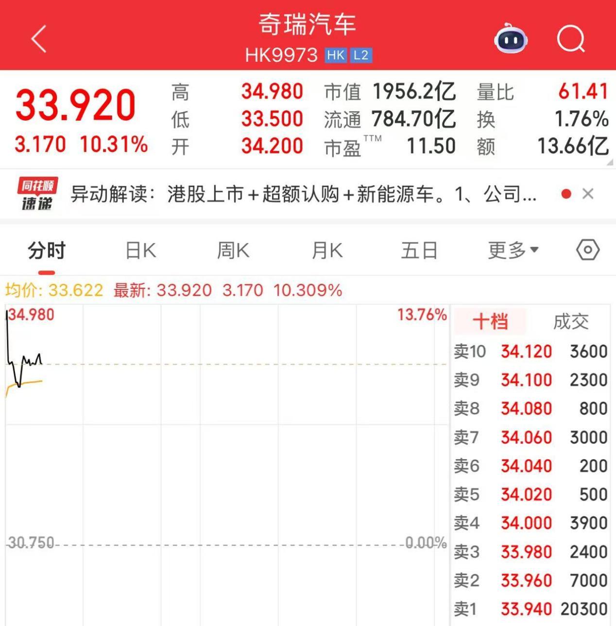 奇瑞上市首日便迎来高开,涨幅超10%,开盘价为每股34.2港元,开盘后一度涨至34.98元,总市值接近2000亿港元。
