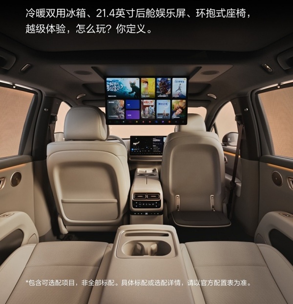 内饰方面,新车配备15.7英寸中控屏+副驾屏联屏,后排还有21.4英寸吸顶屏。另外后排还提供可翻折扶手,并提供可折叠脚托。除此还配备冷暖冰箱、后排车门软质肘托、电动天幕遮阳帘等。新车还搭载理想AD Max高阶辅助智驾。