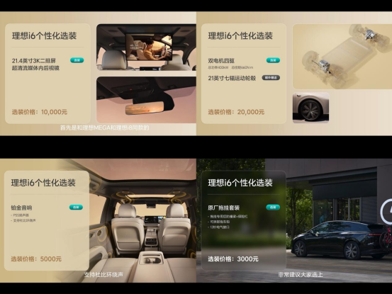 此外,理想i6还提供了其他可选装的配置,21.4英寸后排娱乐屏+流媒体后视镜选装价1万元,双电机四驱动力选装价2万元,还额外赠送21英寸七辐运动轮毂,铂金音响系统选装价5000元,原厂拖挂套装选装价3000元。理想i6这次的配置划分很合理,单车型高配置免去选择的烦恼,并且可以根据需要进行适当的选装,照顾到更多人需求。