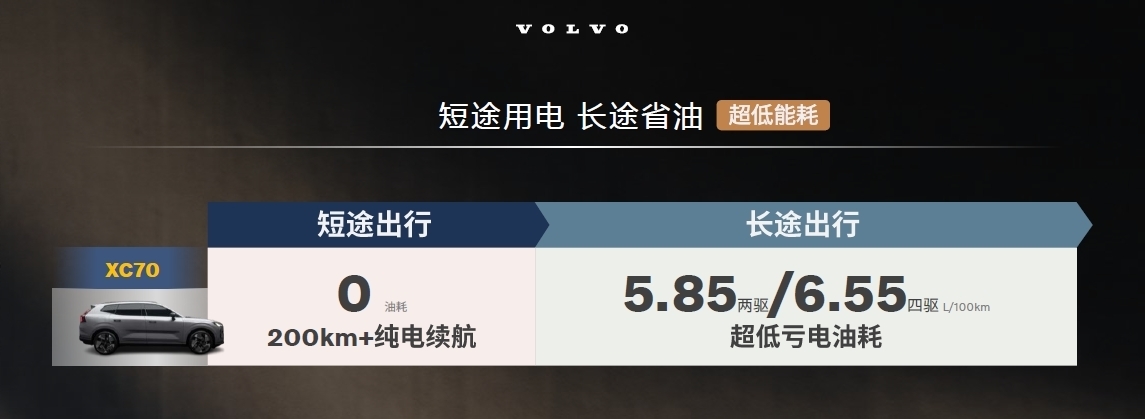 得益于3DHT混动变速箱宽泛的速比,全新XC70的亏电油耗为5.85L(两驱)或6.55L(四驱)/100km,对于中大型混动SUV来说,明显优于德系豪华品牌的同级别竞品。同样超越竞品的还有纯电续航,新车配备40kWh动力电池,CLTC工况纯电续航超过200km,基本可以满足用户一周通勤。满油满电综合续航更是超过1200km,能显著降低补能频率。