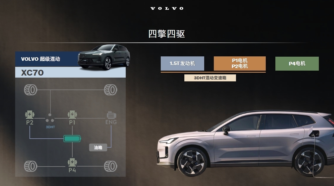 沃尔沃全新XC70是传统豪华品牌推出的首款超级混动车型,相比传统的P2架构插混,全新XC70的P1+P2+P4三电机+3DHT变速箱的超级混动从根本上解决了传统插混“电感弱、续航短”以及增程车“效率低、馈电性能差”等痛点。