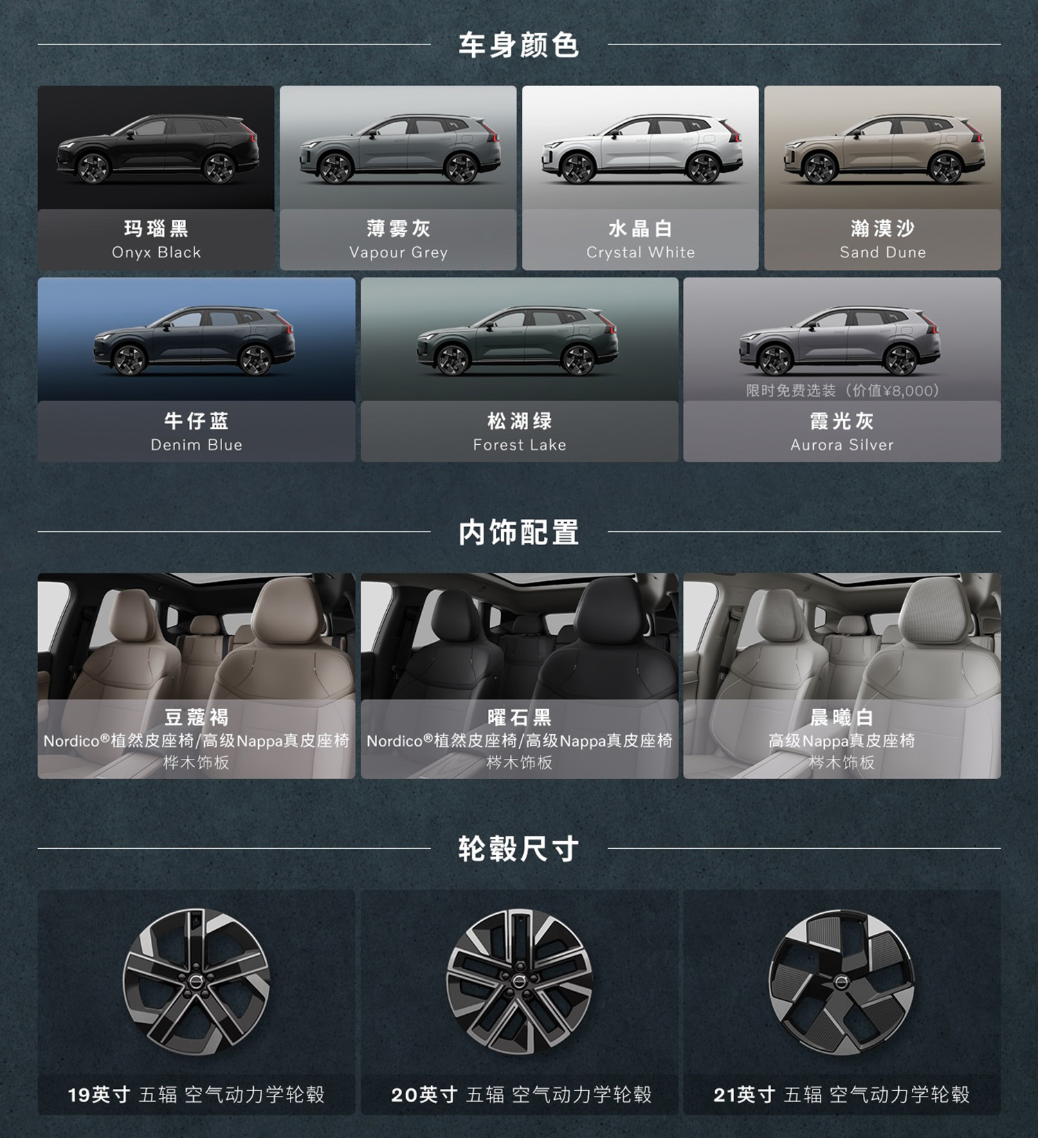 沃尔沃全新XC70共发布7款车身色和3款内饰配色,根据配置差异提供19-21英寸的空气动力学轮毂可选。