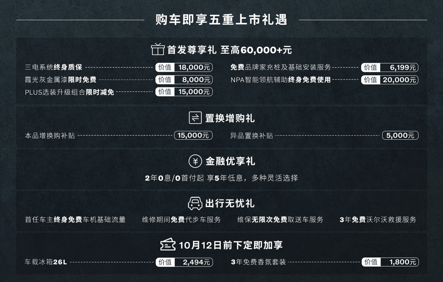 随全新XC70上市,沃尔沃还公布了新车购买礼遇:用户可享价值至高6万元的首发尊享礼,包括三电系统终身质保、霞光灰金属漆限时免费、PLUS选装升级组合限时减免、NPA智能领航辅助终身免费和免费品牌家充桩及基础安装服务。此外,还有至高1.5万元置换补贴、2年0息0首付等金融方案;10月21日前下定还可享3年免费香薰套装和车载冰箱。