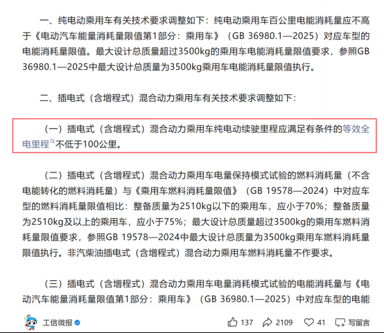 什么?插混纯电续航低于100km要没有购置税国补了?据悉,插混车国补新政刚刚发布了,明年1月正式实施,届时纯电续航低于100km的插混车将不再享受国家购置税减免补贴,这无疑在传递出一个信号:长续航插混车将成为主流,短续航插混车型即将开启淘汰赛。