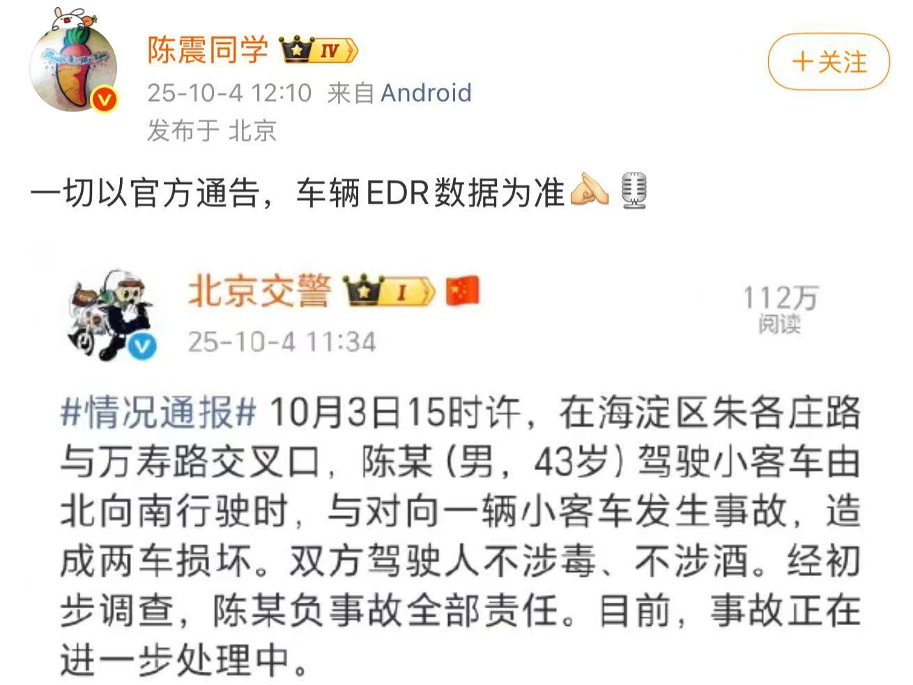 4日中午,陈震转发北京交警的通报,对该事件予以公开回应,并发博称:一切以官方通告,车辆EDR数据为准。
