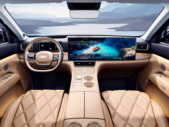 座舱方面,风云T11中控布局比较简洁,最引人注目的还是这一块30英寸6K分辨率的一体式寰宇屏,车机则搭载了8255芯片,车厢内大量应用了木饰板与软性皮革,旋钮和按键也用上了水晶和金属材质,用料水平不错。