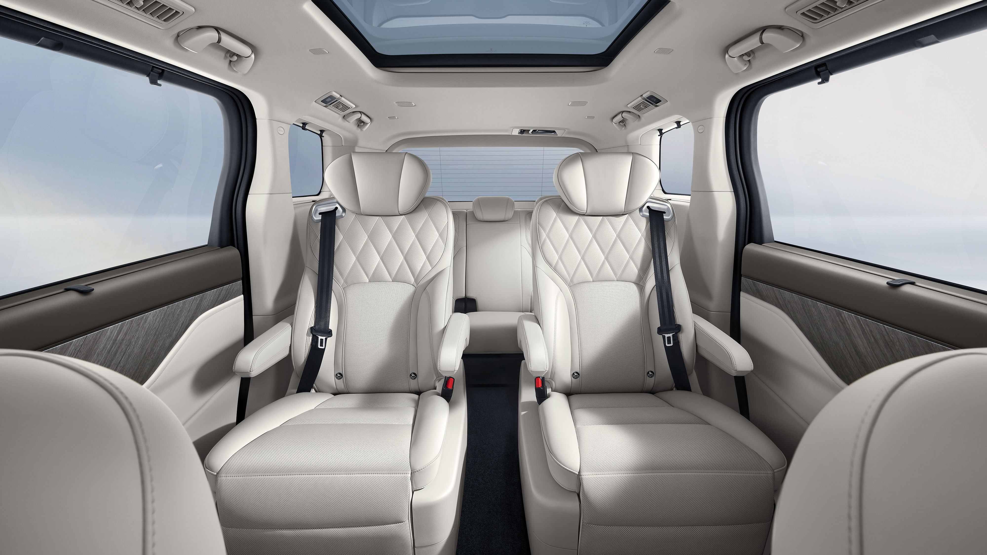 二排“招财猫座椅”采用Nappa真皮包裹,支持电动调节、通风、加热及10点按摩功能,搭配可收纳小桌板与17.3英寸3K后排娱乐屏,打造移动办公与亲子娱乐空间。三排座椅支持前后滑动,最大腿部空间达1285mm,头部空间870mm,配合0.73㎡全景侧窗。