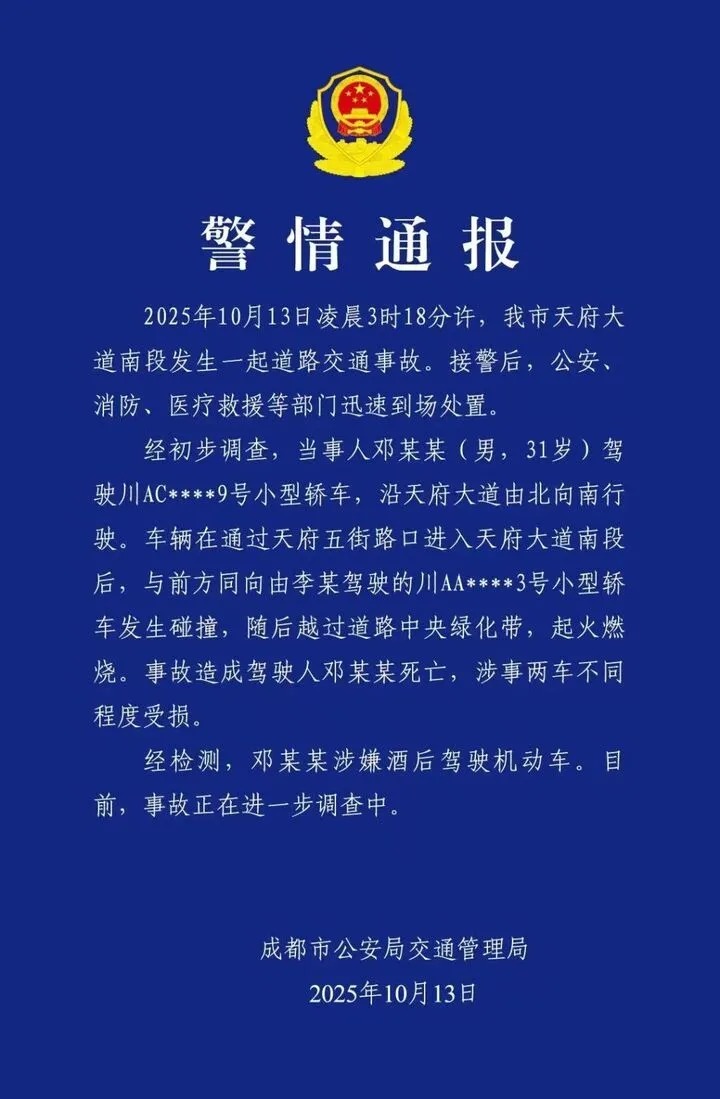 原创 2025年10月13日凌晨3时18分许,四川成都天府大道南段发生一起道路交通事故,一辆小米SU7碰撞前车后,越过道路中央绿化带,起火燃烧,事故造成驾驶人邓某某死亡,并且当事人涉嫌酒后驾驶机动车。