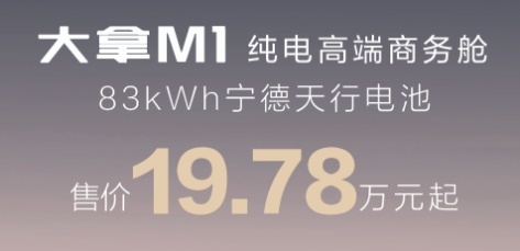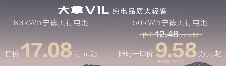 其中,纯电高端商务舱大拿M1,搭载83度宁德天行电池售价19.78万元起;纯电品质大轻客大拿V1L,83度宁德天行电池版售价17.08万元起;50度宁德天行电池版售价12.48万元起,限时一口价9.58万元起。新车上市之际,还带来价值12000元的丰厚限时上市礼遇。