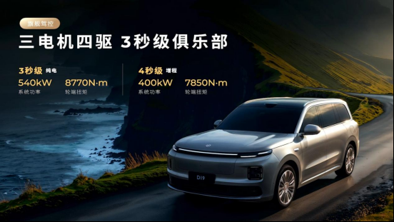 当然,这次发布会最核心的内容还是零跑D19搭载的零跑旗舰D平台的一系列技术,其中我认为最有看点的就是动力、智能化和驾控。首先动力上,零跑D19搭载增程纯电双动力,增程版搭载了80.3kWh的大电池增程方案,什么概念?特斯拉Model 3和Model Y的长续航版的电池都没有这台增程车大!它的纯电续航可以到500km。