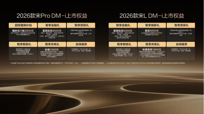 其中,2026款宋L DM-i售价13.98-15.68万元,2026款宋Pro DM-i超级置换权益后,限时售价9.98-12.28万元。同时,两款车型均带来了丰厚的上市权益礼。