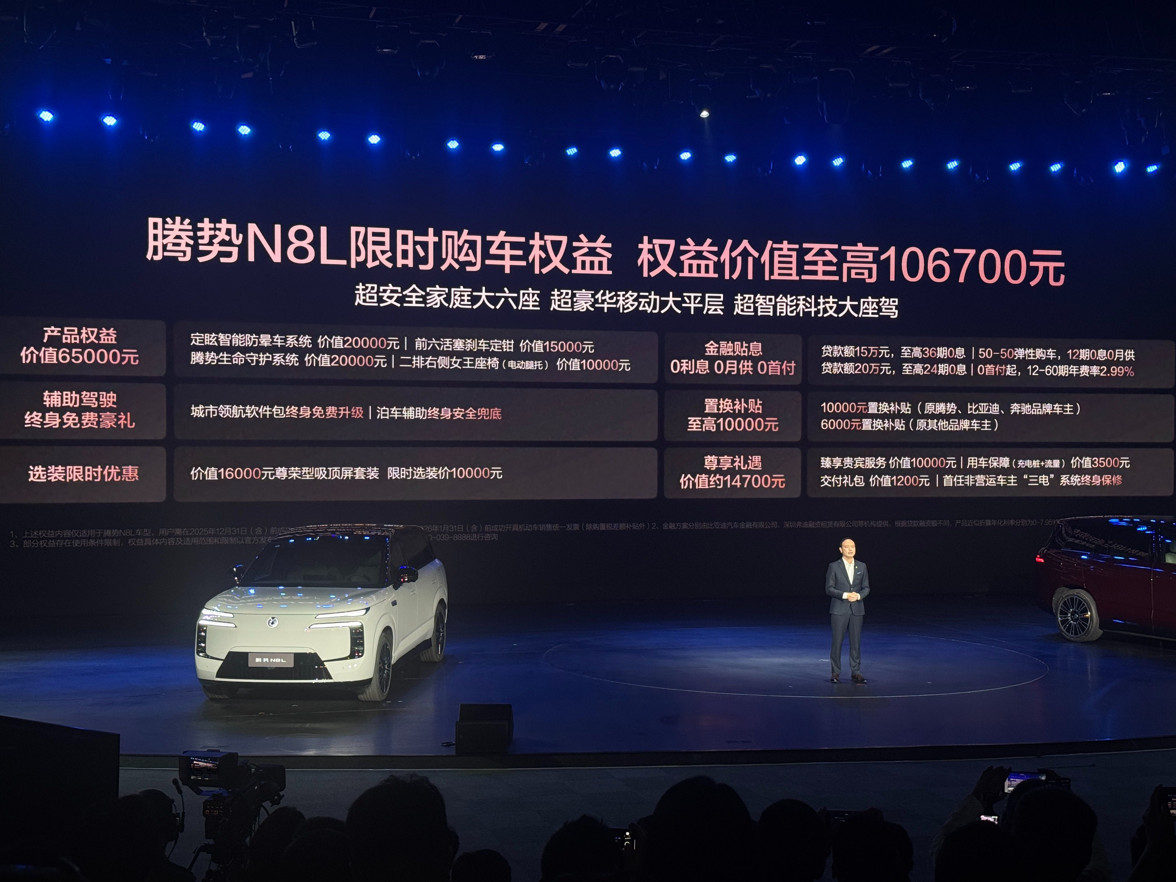 10月28日,腾势N8L正式上市,共推出尊荣型和旗舰型2款车型,官方指导价为29.98万元~32.98万元。新车定位大型SUV,全系标配易三方平台,云辇—A和天神之眼B,在技术层面有自己独到优势。权益方面,权益价值至高10.67万元!包括价值1.7万元的三年免息,最高1万元的置换补..