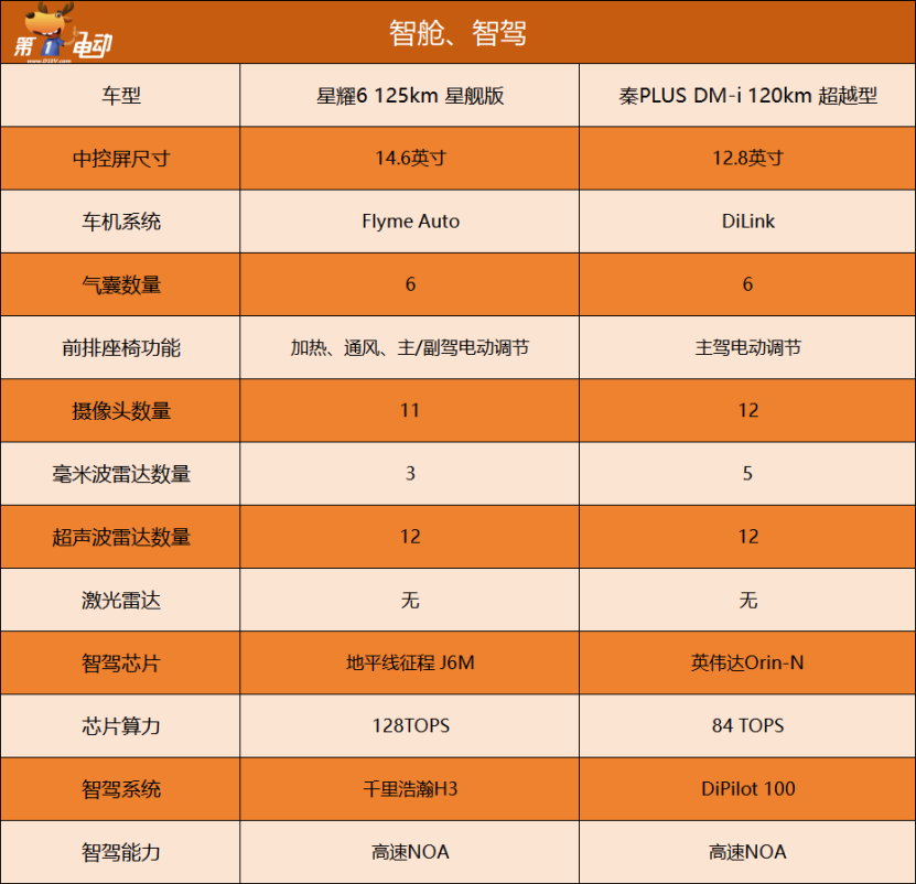 另外,在智舱方面,星耀6不仅车机屏幕更大而且操作系统更强。智驾方面,两车在功能上都支持高度NOA,不同的是星耀6的智驾芯片算力更高,它搭载的是地平线征程J6M,算力达到了128 TOPS,比秦PLUS高出了44 TOPS。当然了,智驾好不好用,不是说算力高就一定好用,算法和数据同样更重要。