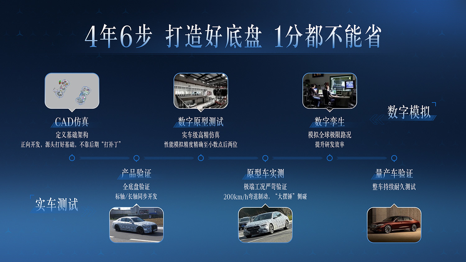 最近几年,有些新品牌寄希望于利用“快”抢得市场先机,而在奔驰看来,好的底盘不仅需要花费足够时间打磨,验证工序和流程更是没有压缩和“减配”的余地。奔驰的底盘研发遵循CAD-产品验证-数字原型测试、原型车测试、数字孪生和量产车验证六大步骤,数字仿真和实车锤炼缺一不可。