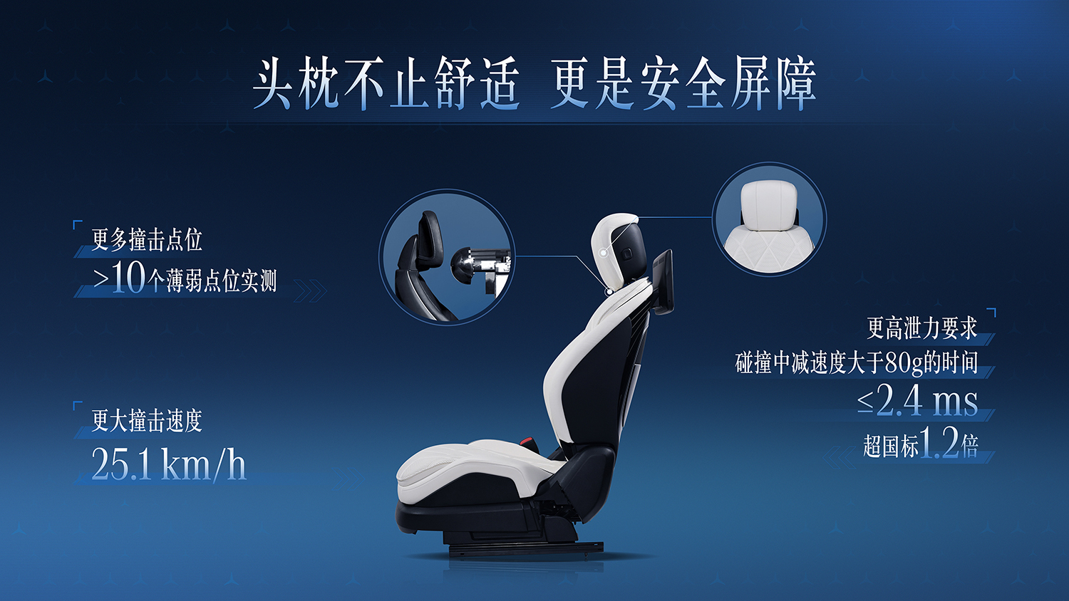 奔驰的头枕安全测试要求模拟人类头部的金属半球以约25.1km/h的速度撞击超10个由数字仿真模拟得出的相对薄弱点位,要求碰撞中减速度大于80g的时间不超过2.4毫秒,其标准超国标1.2倍,奔驰的头枕测试撞击点位更多、撞击速度更大、泄力要求更高,且测试结果要求也更为严苛。
