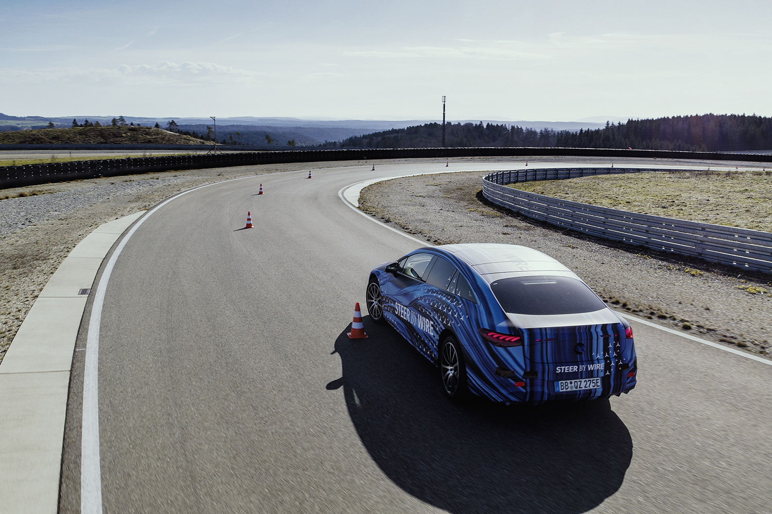 在此次奔驰标准科技日上,最精彩的体验项目莫过于抢先试驾到搭载线控转向技术的奔驰EQS原型测试。这是奔驰底盘科技的最新研发成果,用电信号取代物理结构实现方向盘与转向结构机械解耦。
