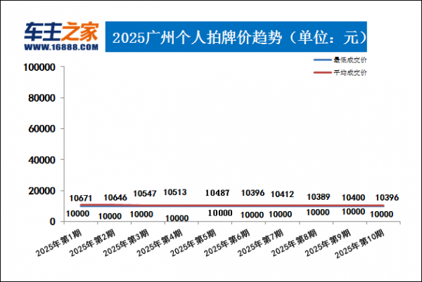 再来看看广州拍牌,整体变化不明显。最低成交价依旧为10000元,平均成交价为10396元。近期未配置成功指标高达上万个。