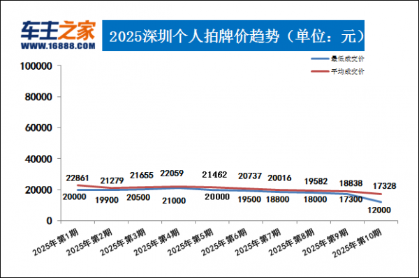 今日,广深两地2025年第10期拍牌结果正式出炉,其中深圳拍牌有明显变化。先看看深圳拍牌情况【深圳拍牌官网截图】深圳10月拍牌最低成交价骤降,低至12000元,属实意外。另外平均成交价也有所降低,降价幅度相比最低价来说较小。本期平均成交价降至17328元,为今年年内新..