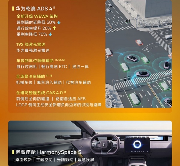 内饰方面,新车采用35.4英寸远端屏搭配15.6英寸中控屏及远端屏。新车还将搭载鸿蒙座舱HarmonySpace 5,搭载乾崑智驾ADS 4,支持车位到车位领航辅助及泊车代驾等。