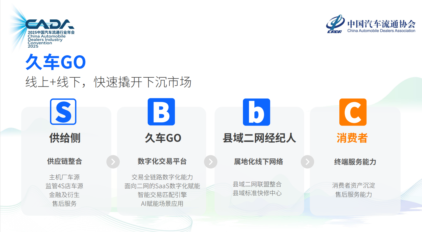 公开资料显示,久车GO作为汽车新零售平台,通过建立行业内最大的下沉市场履约交付网及数智化经营底座,通过数字化驱动,优化了整个汽车流通产业的调度中枢和价值平台,实现生态赋能,共同增长。同时,面对当下行业痛点给出在企业在实践中总结出的破局之道。