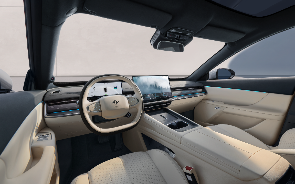 内饰采用超纤柔类麂皮绒与云感亲肌座椅包覆,配备真皮加热方向盘、WANOS 2.0全景声音响、64色氛围灯及智能香氛系统,营造出兼具质感与舒适的驾乘氛围。