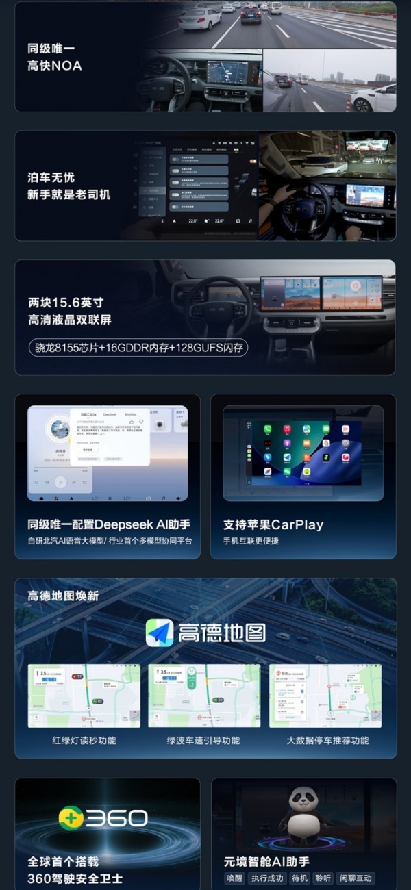 内饰方面,新车采用双12.8英寸联屏,内置高通骁龙8155芯片,支持CarPlay。另外还支持高快NOA领航、全速自适应巡航、泊车辅助等,还提供360安全卫生、元境智舱AI助手等配置。