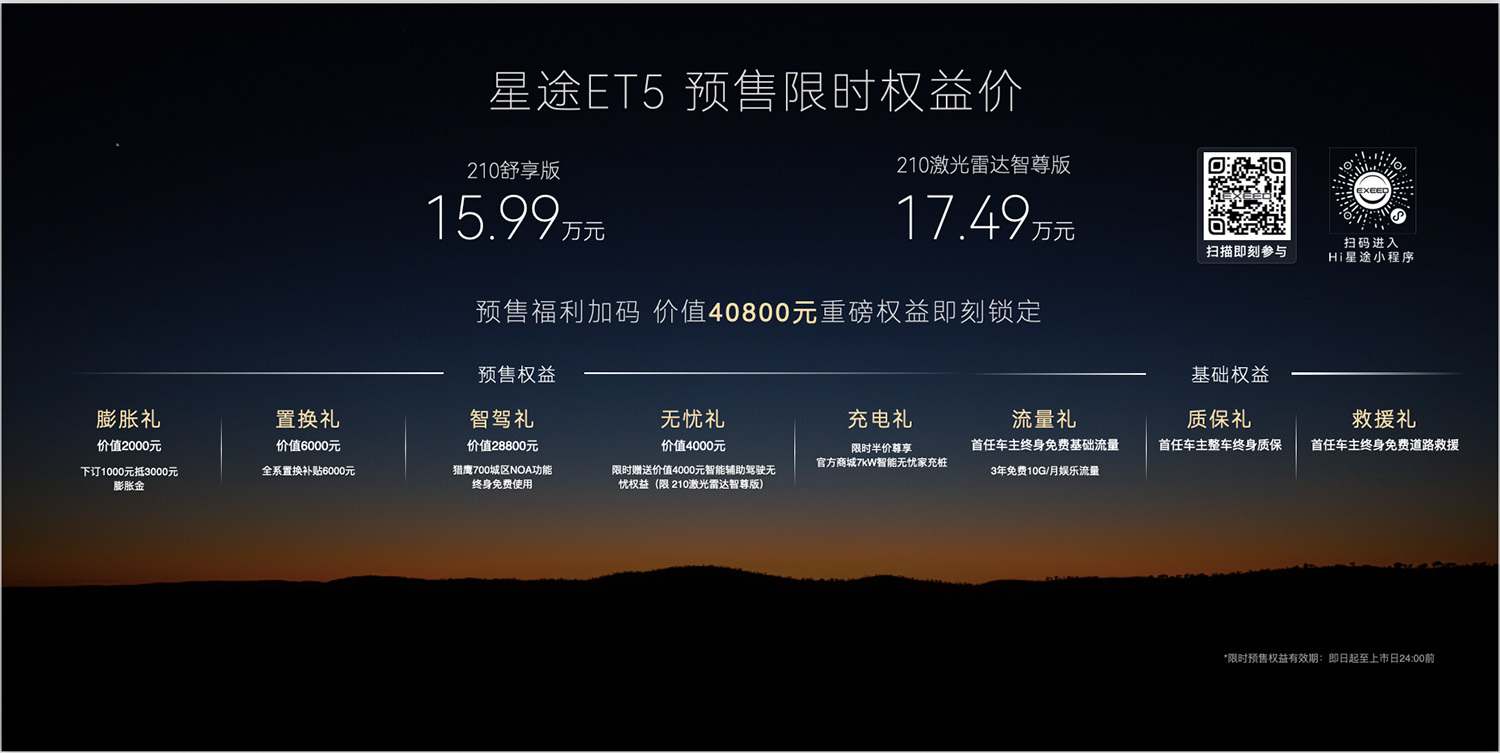 随新车正式开启预售,星途汽车还发布ET5的预售权益,8项预售权益总价值达到40800元,包括下订1000元抵3000元购车款、全系6000元置换补贴、价值28800元的猎鹰700辅助驾驶终身免费、专属4000元智能辅助驾驶无忧权益限时赠送(限210激光雷达智尊版)以及官方商城7kW智能家充桩半价。同时,星途还为首任车主提供三大基础权益,包括终身免费基础流量,3年10G/月娱乐流量、整车终身质保及终身免费道路救援服务。
