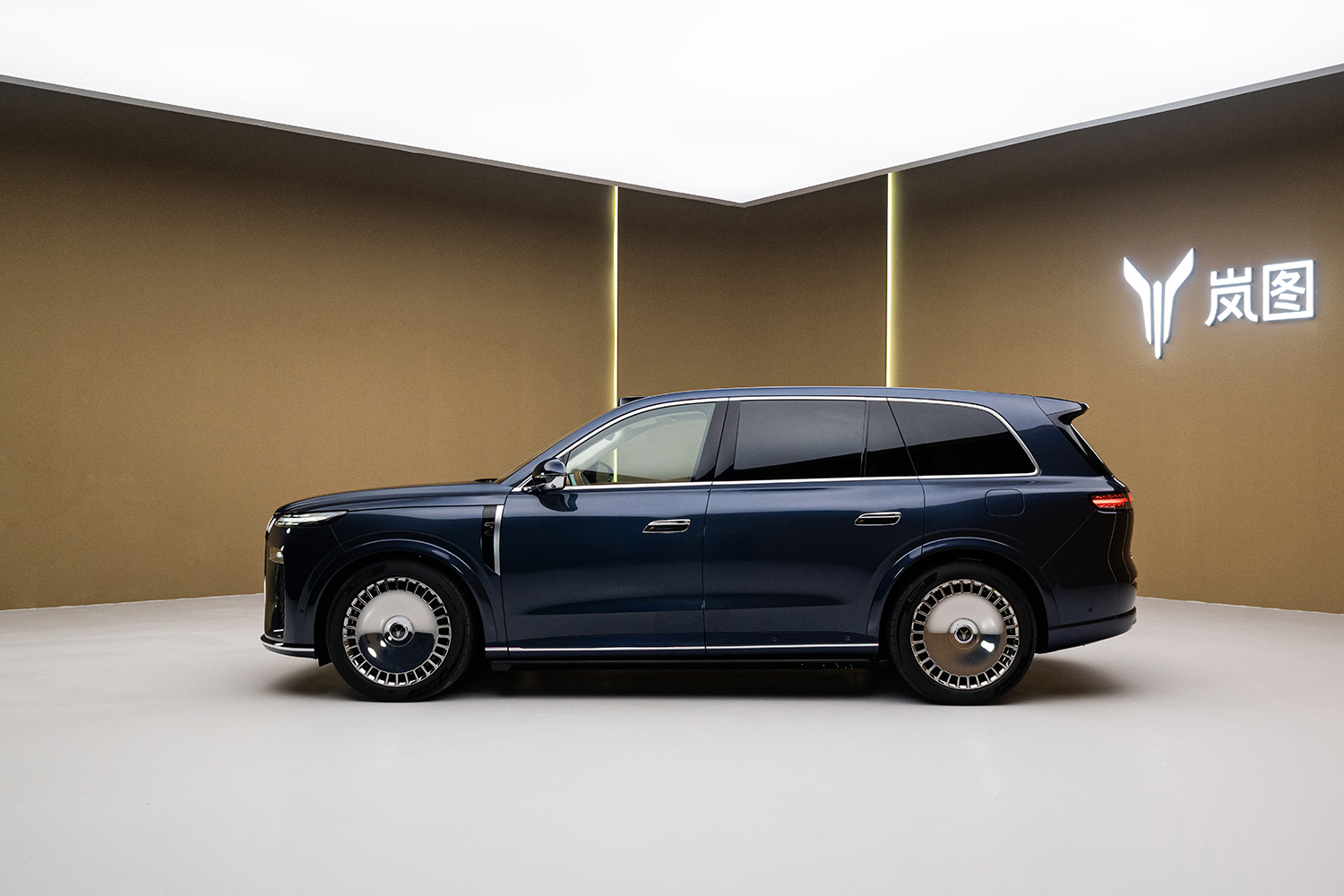岚图泰山定位大型豪华六座SUV,车身尺寸为长5230mm/宽2025mm/高1817mm,轴距长度3120mm,整车姿态庄重霸气,高耸的车头气势十足,车身采用“山海交融”的曲面设计,即突出中国山水画般气韵生动的中国传统美学意境,又通过简约的轮廓线强化了庞大车身尺寸带来威严感。
