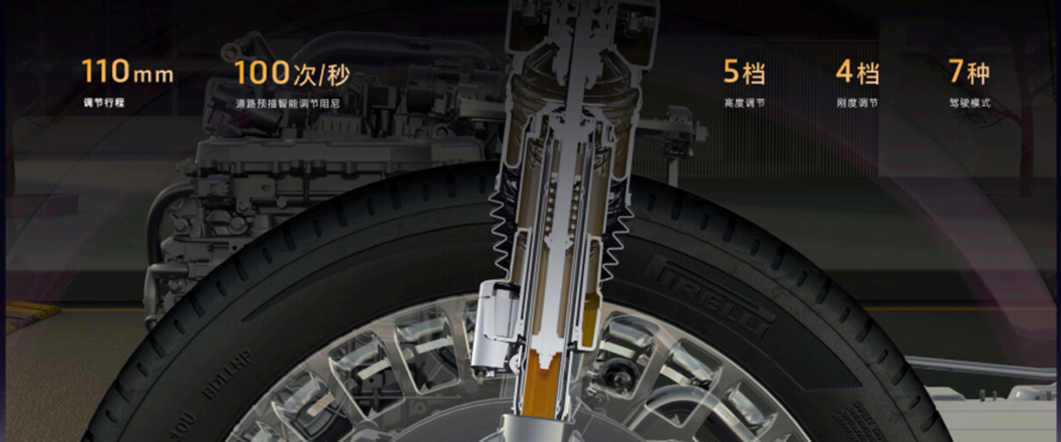 底盘方面,岚图泰山采用前双叉臂/后五连杆独立悬架,并且是“世界第五、中国第一”配备三腔空气弹簧的车型。岚图泰山拥有同级别最长的110mm底盘高低调节范围,三腔空气弹簧具备5档高度、4档硬度调,实现过坎冲击度降低13%、余震收敛性降低40%,驾驶的平顺性提升40%,大幅提升驾驶舒适性。