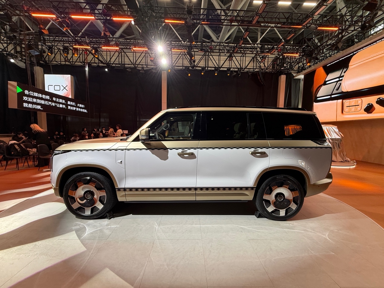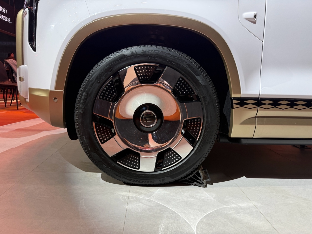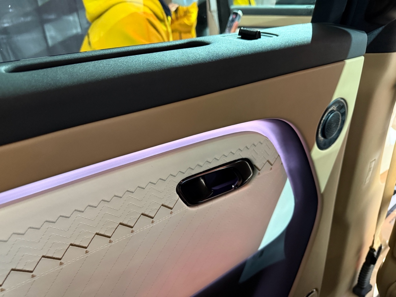 凑近了才发现,白色车漆里混着细小的闪粉,在展馆的灯光下不会显得刺眼,只会折射出淡淡的晶体光泽,和哑光金的沉稳质感搭配在一起,很有分寸感。