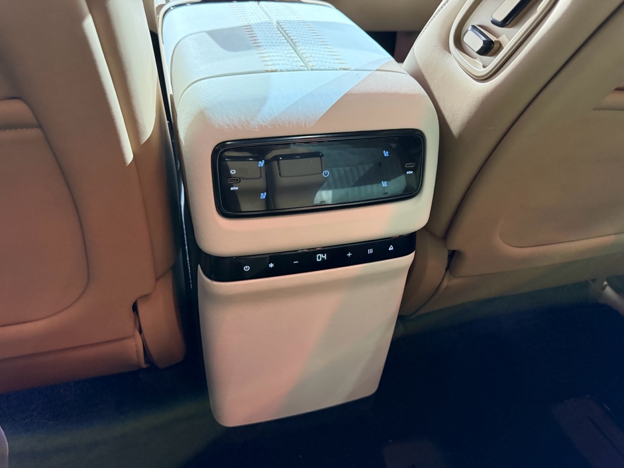 车内的配置没有做得花里胡哨,但实用性拉满了。中控台是简约的设计风格,四屏联动的布局很直观,仪表盘、中控屏、后排吸顶娱乐屏和流媒体屏幕的显示都很清晰。第二排中间的扶手箱里藏着一个8.5L的冷暖冰箱,打开看了一下空间不小,夏天放几瓶可乐,冬天温个奶瓶都很方便。车顶用了超纤绒材质,摸上去软软的,不会像有些硬顶那样有冰冷感,整体的内饰氛围很舒服。