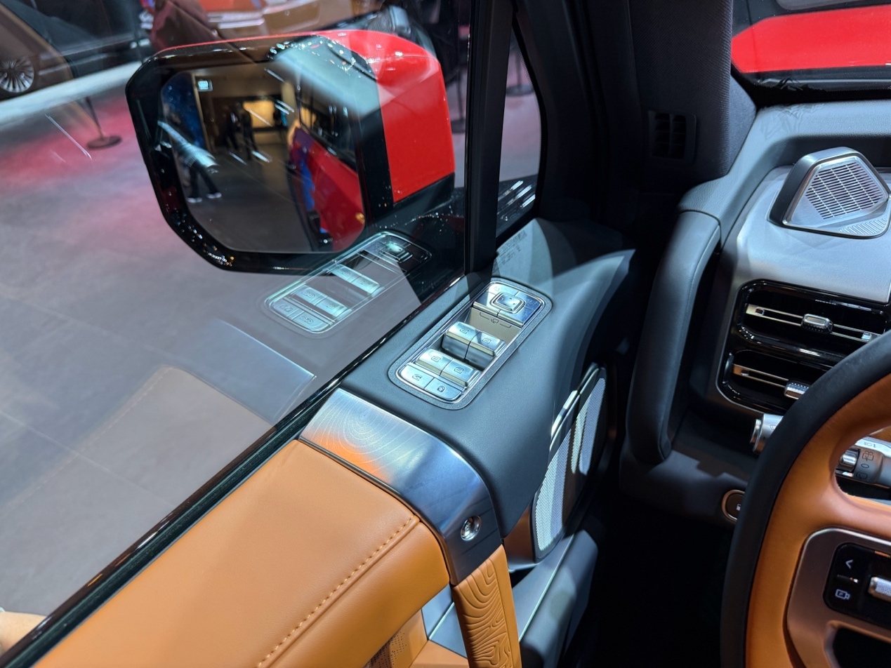 车身侧面的变化尤为显著,加宽的轮拱套件向外延伸,为 33 英寸的 “BLACKBEAR” 全地形轮胎提供了充足空间。黑色防脱圈轮毂采用轻量化锻造工艺,轮胎上的白色字母与轮毂中央的品牌标识形成对比,越野氛围拉满。A 柱下方的高位进气口是涉水路段的关键保障,车顶的行李架并非装饰,其承重结构可满足备胎、油桶等装备的固定需求。车门处的 “G700” 标识下方,隐藏着电动踏板的控制按键,兼顾了实用性与通过性。