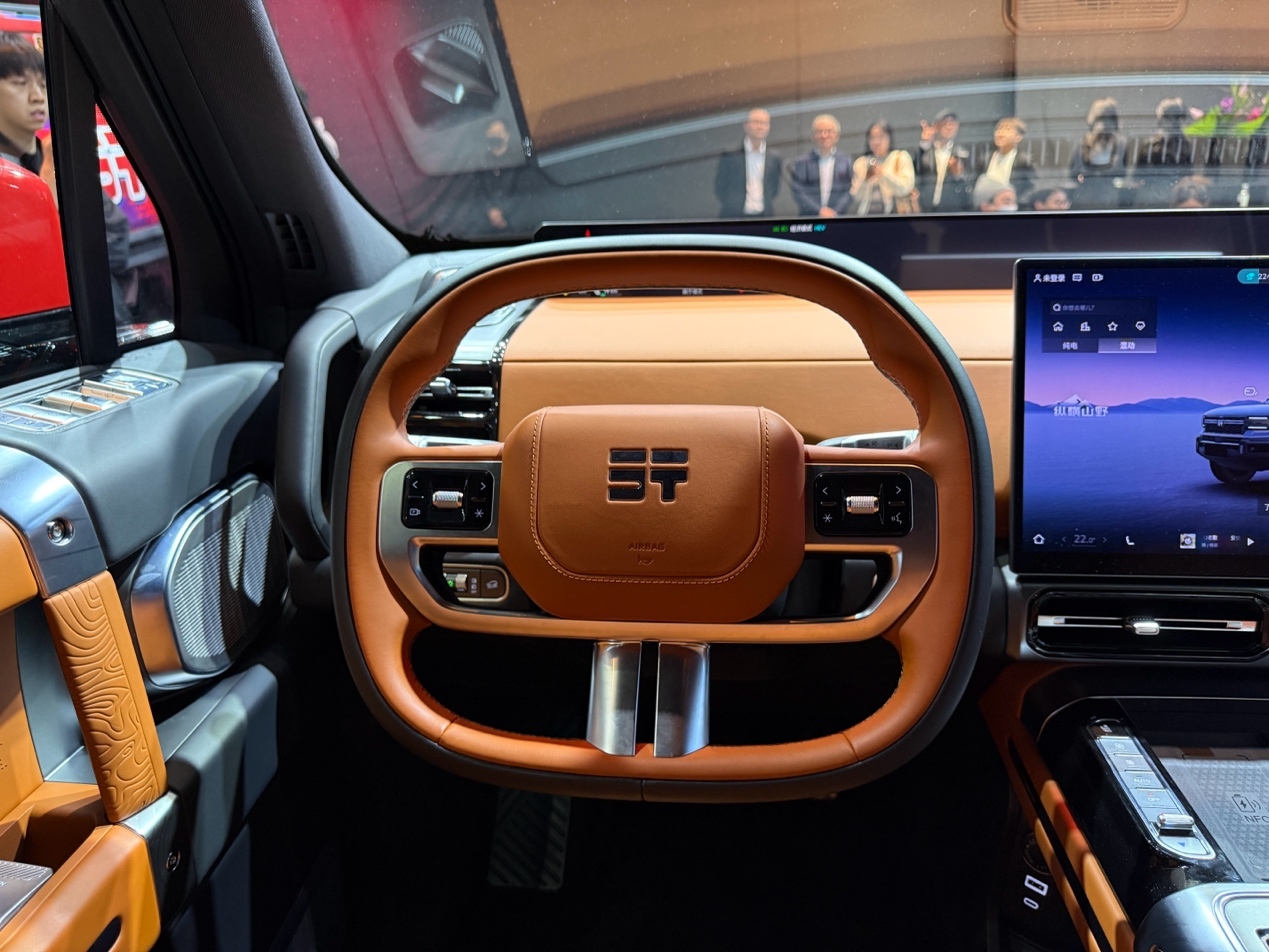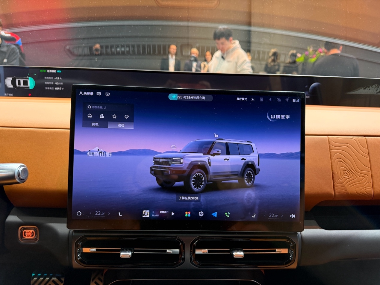 中控区域以实用为核心,悬浮式中控屏显示着 “纵横山野” 的界面,与越野主题契合。屏幕下方的物理按键区布局清晰,带有 “X” 标识的越野控制旋钮是核心配置,周围环绕着四驱模式、差速锁、陡坡缓降等功能按键,按键的反馈力度与行程调校得当,盲操作也能精准识别。