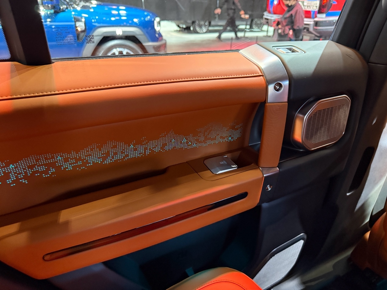 副驾前方的饰板采用独特的地形纹设计,与外观的越野属性呼应,金属铆钉装饰强化了工业风质感。中控台下方的储物格空间充裕,配备防滑垫,方便放置手机、对讲机等装备,旁边的无线充电区域做了防汗处理,实用性突出。