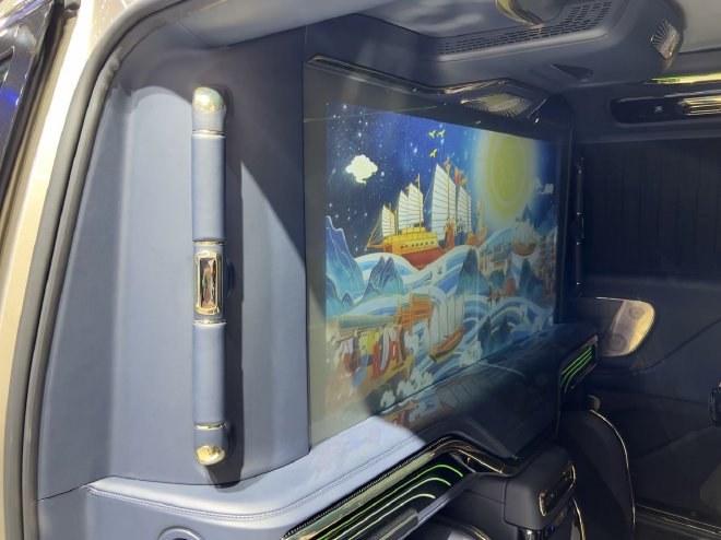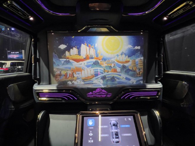 驾驶舱内部采用黑金双拼Nappa真皮材质,搭配玫瑰金饰件点缀。副驾仪表台设有“山峰日月”刺绣图案与水墨山水画装饰。