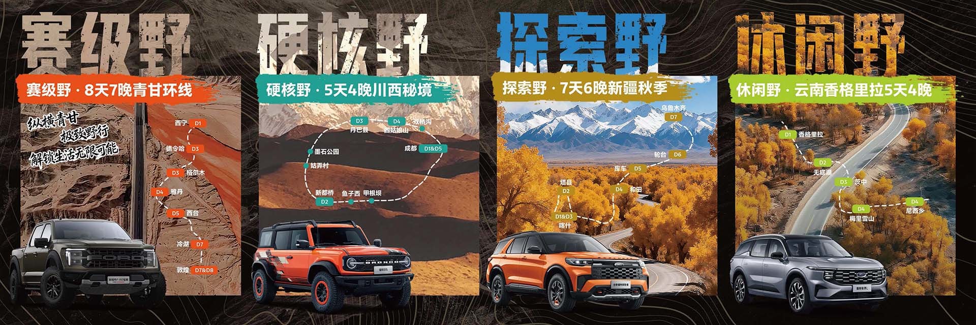 与此同时,福特手握三大王牌:覆盖全动力场景的丰富产品矩阵,从路上延伸至目的地的沉浸式体验,以及由全球视野与本地社群共同构筑的深厚探险文化。以 “四级野”(赛级野、硬核野、探索野、休闲野)深度诠释品牌“探索/野行”的品牌定位,精准定义不同层级的用户需求、产品能力与应用场景,激发每一种天性,为每一次出发做好准备。