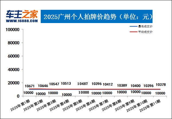 广州拍牌价依旧稳,其中最低成交价保持在10000元,平均成交价则为10378元。
