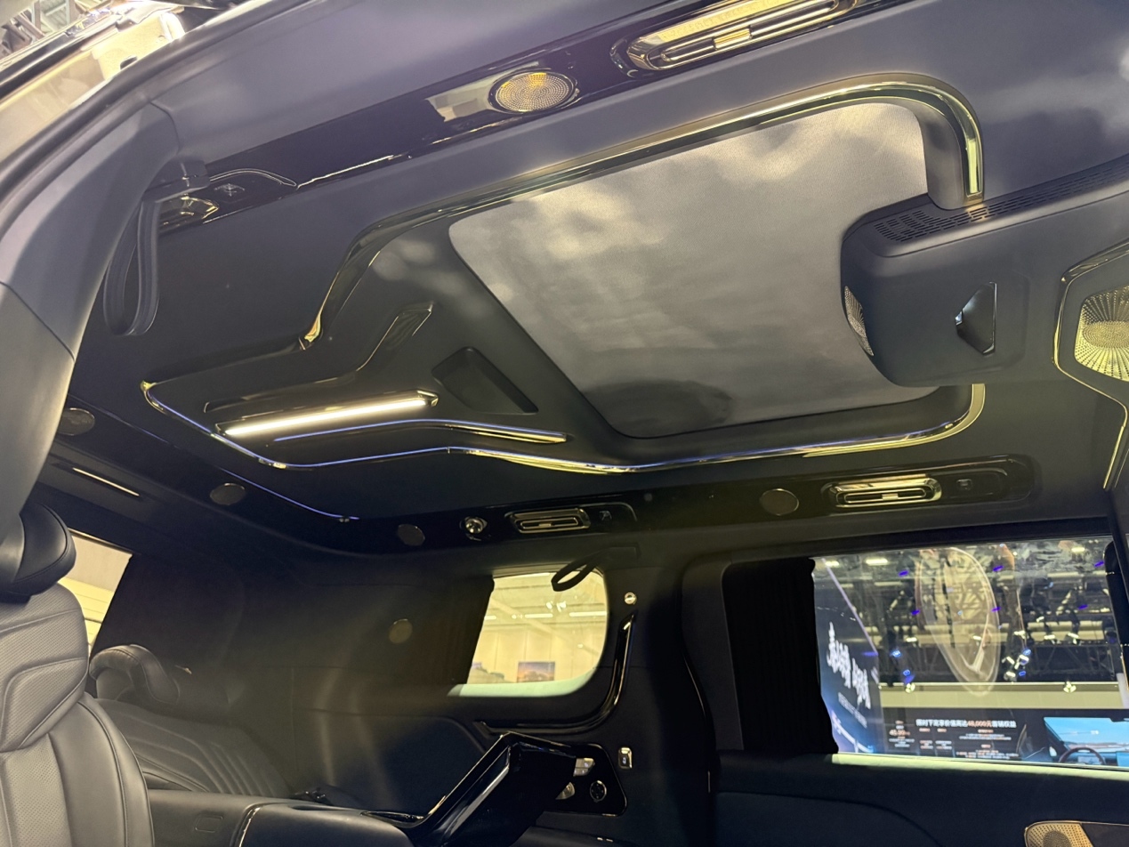 车顶的设计同样用心,大面积的翻毛皮材质覆盖,触感细腻且能有效提升车内的豪华氛围。车顶的金属饰条并非简单的直线,而是带有一定的弧度,与车内的曲线元素相协调。车顶还隐藏了氛围灯,虽然静态下未点亮,但从布局来看,其点亮后应该能营造出不错的光影效果。