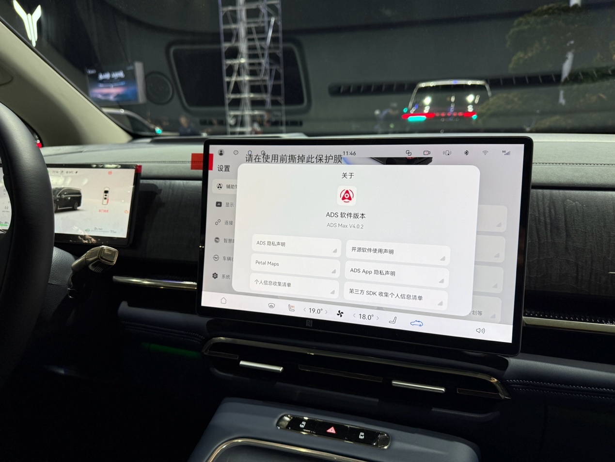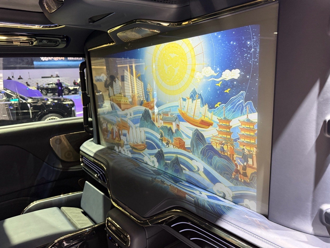后排空间是这款车的核心舞台。最引人注目的是那块超大的娱乐屏幕,其上展示的国风插画将山水、帆船、楼阁元素融为一体,色彩明快且细节丰富,瞬间将车内空间的氛围感拉满。屏幕并非单纯的娱乐载体,其边框与周围的饰板采用了一体化设计,过渡自然。
