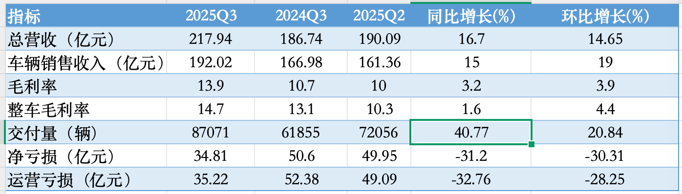 财报数据显示,蔚来三季度总营收达到217.9亿元,同比增长16.7%;共交付新车87,071台,同比增长40.8%,环比增长20.8%;核心指标车辆毛利率达到14.7%,创下近三年新高,综合毛利率达到13.9%;净亏损同比收窄31.2%至34.805亿元。