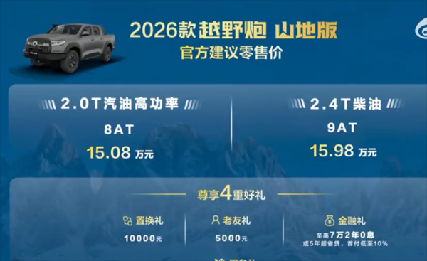 动力方面,商用炮山地版搭载2.0T及2.4T柴油发动机,传动匹配6MT、8AT及9AT变速箱;越野炮山地版搭载2.0T汽油高功率及2.4T柴油发动机,传动匹配8AT及9AT变速箱。新车还搭载博格华纳4A+MLOCK超级四驱系统。