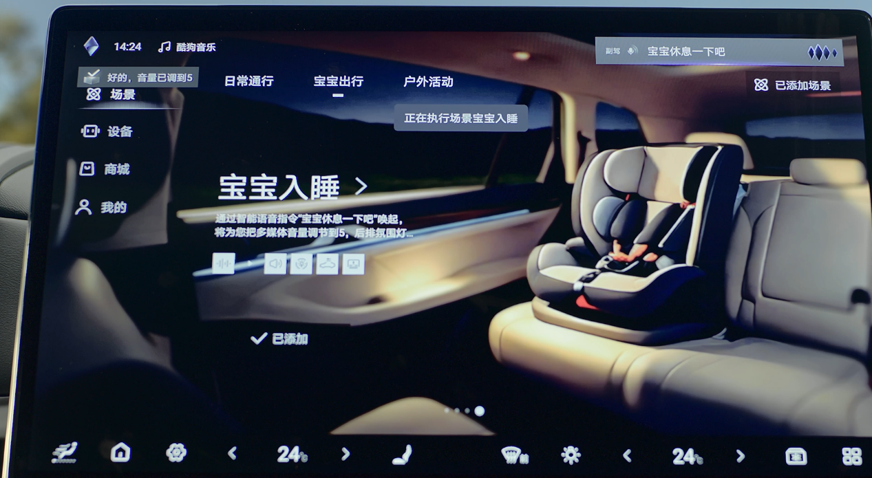 智慧物联新增日常通勤、宝宝出行、户外活动3大场景。同时,智慧物联还新增对座舱IoT设备的语音控制,通过语音指令即可控制多种生态产品,打造更智能便捷的用车体验。日常通行场景中,一句语音指令即可自动调节空调温度、开启导航并播放音乐;宝宝出行场景下,儿童座椅可实现智能迎宾、自动回正,语音指令更能一键营造舒适睡眠环境;户外活动场景则能瞬间开启无麦K歌,配合氛围灯音乐律动,让旅途充满乐趣。
