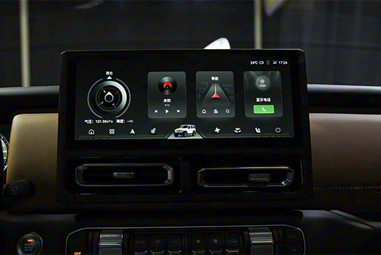 内饰方面,整体延续硬派SUV的设计语言,在强化科技感的同时,注重实用性与操作便捷性,空调与越野功能控制区都配备了实体按键布局。配置方面,新车配备10.25英寸全液晶仪表与12.3英寸中控屏组成的双联屏,支持导航及手机互联功能,并全系标配前/后驻车雷达与360°全景影像。