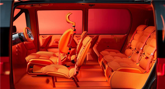 内饰部分,新车采用极简设计风格,取消了中控台设计,驾驶位布置在中央,形成1+3的四座布局或3+3的六座布局。另外,驾驶席还可旋转座椅,后排座椅则可以放倒并加装床垫,想象力十分丰富。